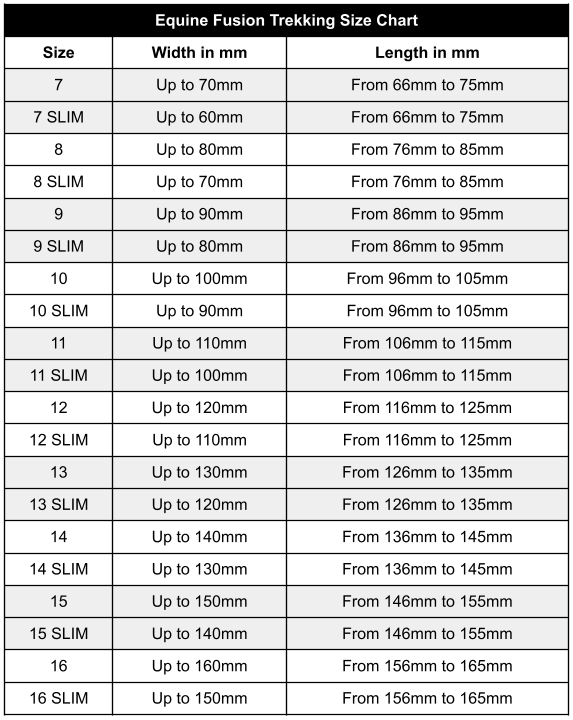 The Trekking model is a shallower boot and we find they come up smaller than the size chart suggests. We suggest knocking 5mm off both the width and length on the size chart. For example, the suggested hoof size for a size 13 Regular in the Trekking would be a maximum hoof width of 125mm and a maximum hoof length of 130mm.