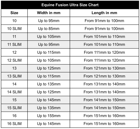 The size chart for the Ultra model is smaller than the other Equine Fusion models yet the upper design is deeper and more flexible so they can often accommodate a larger hoof than the size chart suggests.